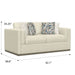 - The Cecily loveseat draws quiet attention with its balanced blend of structural and tailored shapes and gray solid wood trim.