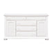 Obtain a fashionable cottage look with this 2 door 5 drawer dresser. The oyster white finish is accented by louvered panels and wooden knob hardware. Storage abounds with the 3 large fully stained drawers, 2 smaller flip down top drawers, and the adjustable shelf located behind each louvered door.