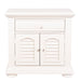 Obtain a fashionable cottage look with this 1 drawer, 2 door night stand. The oyster white finish is accented by louvered panels and wooden knob hardware. Storage abounds with the felt lined top drawer and adjustable shelf behind the two doors.