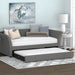 The Vienna daybed is a versatile addition to any space, whether it's a home office or a studio apartment. Its flared arms and gently curved back are upholstered in a woven fabric, offering a stylish look. By day, pile on the pillows to create the perfect lounging spot; by night, pull back the covers for a cozy bed. The convenient trundle pulls out effortlessly, serving as hidden storage with a divider bar or accommodating a second twin mattress for overnight guests. Enjoy the extra functionality and charm the Vienna daybed will bring to your home.