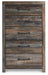 When merged in just the right way, rustic and industrial styles can make one happy marriage. Case in point: this bedroom chest. A refined take on barn board beauty, its complex, replicated wood grain showcases hints of burnt orange and teal tones for a sense of weatherworn authenticity. Elongated drawer pulls elevate the aesthetic.