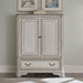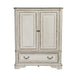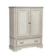 This door chest is the perfect way to accent your room with an effortless blend of European Traditional design. Weathered brown whitewash top paired with the antique white finish creates a truly unique look. Softness is added to the design with canted corners and rounded pilasters, accompanied by bead molding on each drawer front. The chest features 1 fully stained interior drawer, 3 pull out trays, 3 adjustable shelves and is framed by two wrap around doors.
