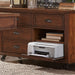 Create a natural feeling with the Arlington House credenza. Crafted with poplar solids and acacia veneers, this piece features industrial metal casters, bottom case dust proofing, fully stained full extension drawers, a large file drawer, and a pull-out printer shelf with an adjustable shelf above. The cobblestone brown finish accompanied by antiqued pewter cup pull hardware is sure to tie any space together.