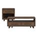 Define your living space with the sophisticated mid-century modern design of the Brisbane Occasional Table Set in Brown. Crafted from solid wood with a rich walnut veneer, this set blends clean lines with warm tones for a charming and inviting look. The open shelves add aesthetic appeal and effortlessly extend staging area for your favorite decorative trinkets, while the coffee table's casters—resting neatly under the table base—simplify maneuvering.