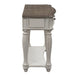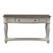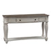 Accent your space with the perfect blend of European design with the Magnolia Manor sofa table. Crafted of poplar solids with white oak and birch veneers, this piece features one fully stained interior drawer with full extension drawer glides that make access to storage a breeze, fancy face top finished in a weathered brown with whitewash, canted corners, a curved front, and a framed drawer front with bead molding for added style and dimension, accented by antique pewter knob hardware. Users can enjoy the convenience of added storage for items from magazines, to cozy throw blankets with the bottom shelf. Warm antique finishes and artistic distressing along with grand scale create a piece to be passed to generations.