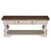 Enjoy a game night with friends around the Morgan Creek cocktail table. Crafted of poplar solids with pine and birch veneers, this piece features an antique white finish with spatter and watermark accents with a wire brushed tobacco planked top, appealing pewter nail head corner accents, one full extension drawer and a bottom shelf for additional storage, casters for easy moveability, anchored by round turned legs flowing into bracket feet. This warm and luxurious cocktail table would make a great addition to any traditional home.