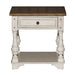 Enhance your space with the Morgan Creek end table. Crafted of poplar solids with pine and birch veneers, this piece features an antique white finish with spatter and watermark accents with a wire brushed tobacco planked top, appealing pewter nail head corner accents, and one full extension drawer and a bottom shelf for additional storage, anchored by round turned legs flowing into bracket feet. This warm and luxurious end table would make a great addition to any traditional home.