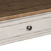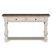 Elevate your space with the Morgan Creek sofa table. Crafted of poplar solids with pine and birch veneers, this piece features an antique white finish with spatter and watermark accents and a wire brushed tobacco planked top, appealing pewter nail head corner accents, and two full extension drawers with a bottom shelf for additional storage, anchored by round turned legs flowing into bracket feet. This gorgeous sofa table will bring a luxurious feel to any traditional space.