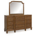 This striking dresser looks equally at home in traditional or modern settings. A wood tone finish offers a casual modern look. Spacious drawers incorporate picture frame moulding and champagne goldtone pulls for a clean yet sophisticated design. Combined with the top's chic inset metal frame, it's a wonderful style awakening in the bedroom.